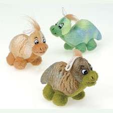 5.5 inch plush velour dinosaurs in assorted print colors as shown. Loop on back for hanging/display.