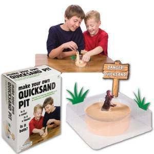 Make Your Own Quicksand Kit by Toysmith Learn how Quicksand works! Make your own quicksand pit. Is it a Solid? Is it a Liquid? Could it be Both? We've all sees the hero sucked down into the quicksand pit. How does it really work? It occurs naturally and is solid ground that has turned into a liquid from too much water. The term "quick" refers to how fast sand changes from a solid to a liquid. This Kit comes with everything you'll need including: Measuring Cup Powder Mix Pit Container Pit Decoration Sheet 2 Plastic Animals (victims) Color Mix Complete instructions For ages 6 years and up Not for children under age 3 years: small parts : choking hazard.